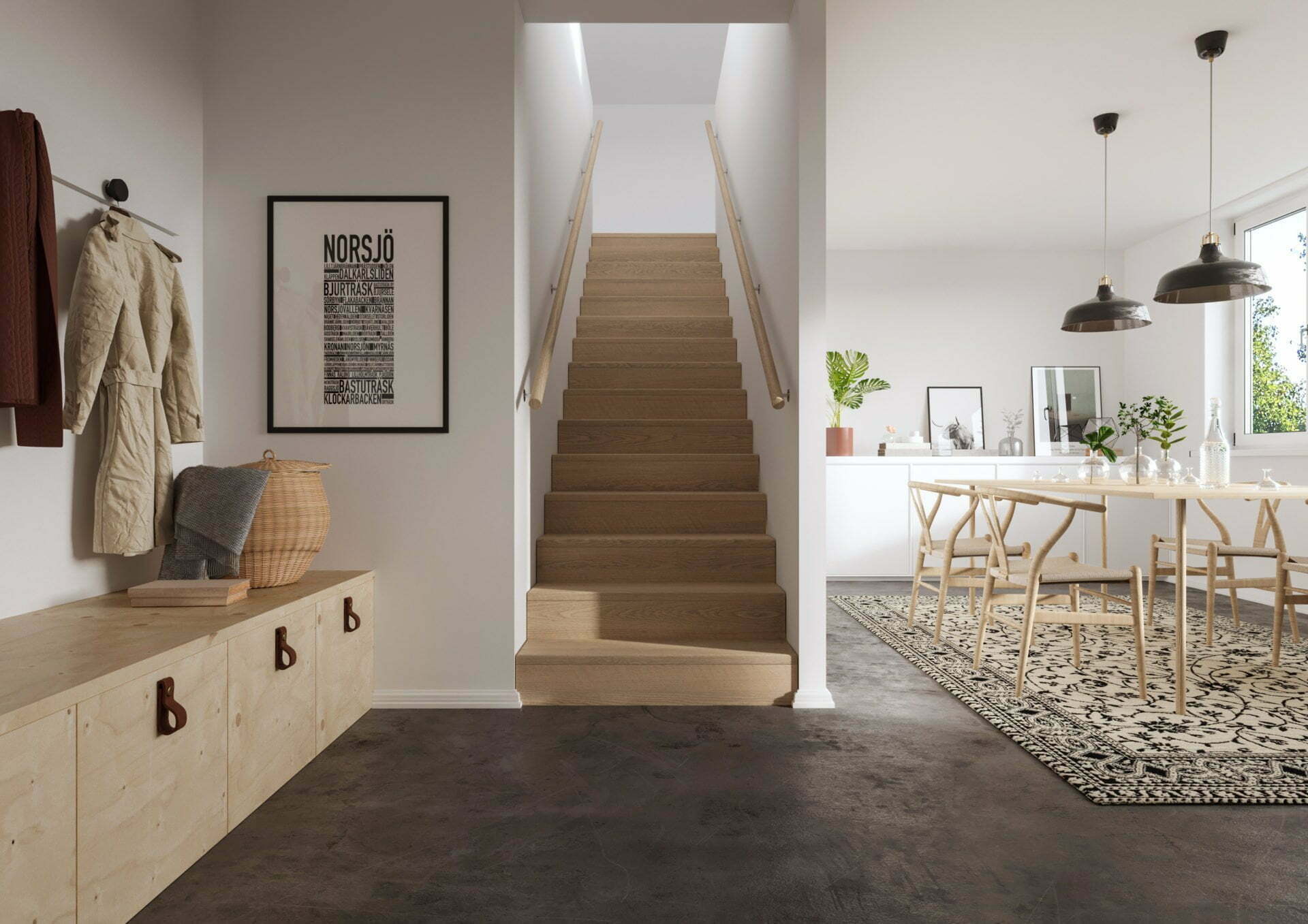 Bas Optimal har underliggande vangstycke. Det ger en enkel, ren och luftig design som alltid upplevs som modern och tidlös. En trappa med underliggande vangstycke kan både stå fritt i rummet och vara inbyggd med förråd under.